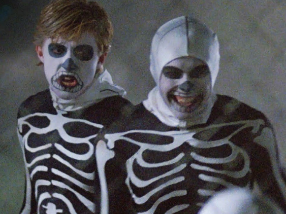But she can follow the teenagers. All the way towards an open field next to an shabby-looking apartment building, where the teenager being chased - Daniel, obviously - tries to climb over the fence to try and reach the building, only to be pulled back off it by the group of skeleton-clad guys who have finally caught up with him.